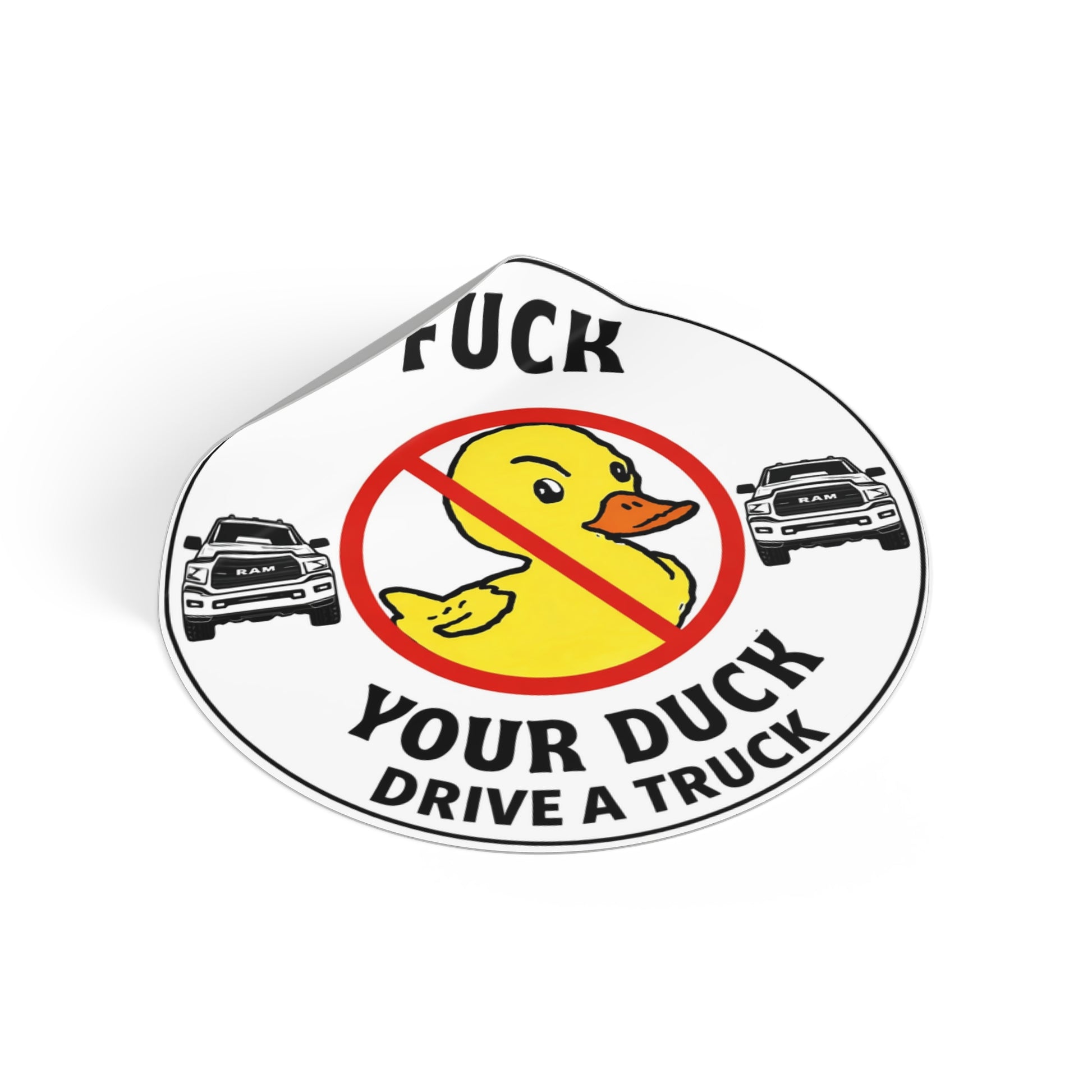 Loud, unapologetic round vinyl stickers made to stick wherever you want to make a statement. The bold graphic — a cheeky crossed-out rubber duck flanked by truck icons and blunt lettering — reads like a punchline on your bumper, toolbox, cooler, laptop, or tailgate. The matte laminate keeps the colors vivid while toning down glare, and the durable, weather-resistant vinyl and waterproof adhesive mean this sticker stays put through rain, road grime, and sun. Peel-and-stick application makes it quick to add personality to gear or hand out to friends who share the same sense of humor.
